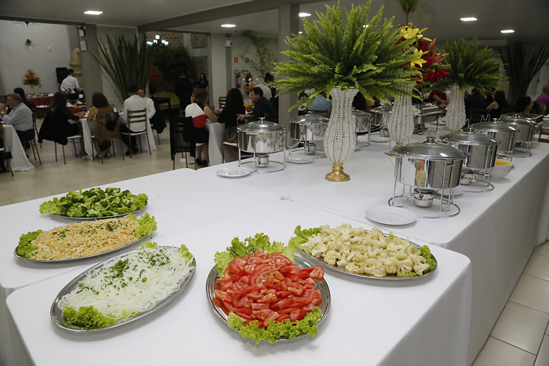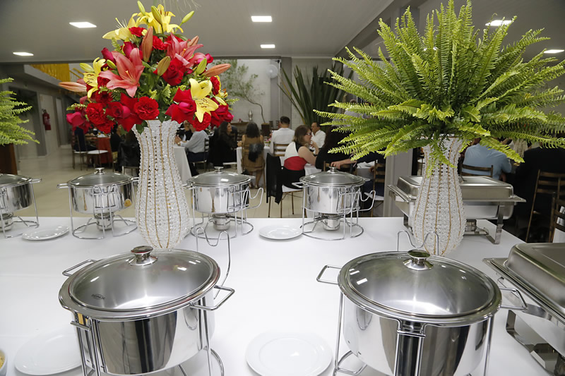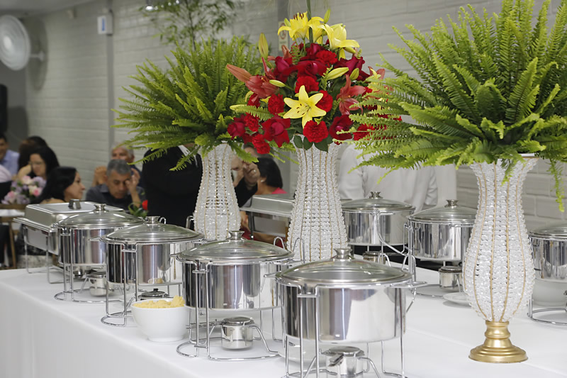 Possuímos todos utensílios para servir ( pratos , talheres , copos , mesas de buffet , rechault , toalhas brancas )